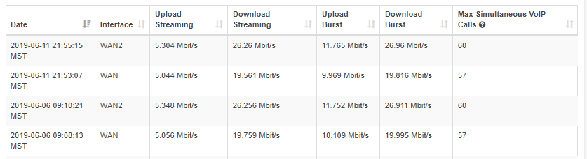 Advanced View in the Traffic Prioritization, however it is not recommended if this site has VoIP phones or real time prioritization need. Primary speed tests are generated only when the firewall reboots. You will also see an estimated maximum number of simultaneous VoIP calls available at the given speed, assuming an 88kbps u-law codec. It is recommended to generate speed tests during normal business hours in order to accurately measure typical business speeds. Getting core speeds by rebooting at night are a false test and can cause problems because it's not real when your neighbors are using the Internet.